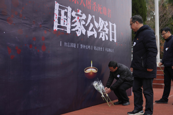 上午9时59分,悼念仪式正式开始。10时01分,凄厉的警报声穿越城市上空,时间在这一刻凝固,全体师生集体静默。山河共呜咽,寰宇同悲戚,86年前的今天,侵华日军侵入南京,制造了惨绝人寰的大屠杀。“1937.12.13”,这个满含伤痛和血泪的日子,承载着一个民族刻骨铭心的记忆;“300000”,这个用皑皑白骨垒成的数字,记载着中国人永志不忘的伤痛。随后,师生代表依次献上菊花,愿逝者安息,生者缅怀,致敬革命先烈,感怀国家之殇。活动最后,校团委宣传部广播台学生代表齐声朗诵《和平宣言》,发出庄严的和平誓言,铿锵有力,声声入耳。