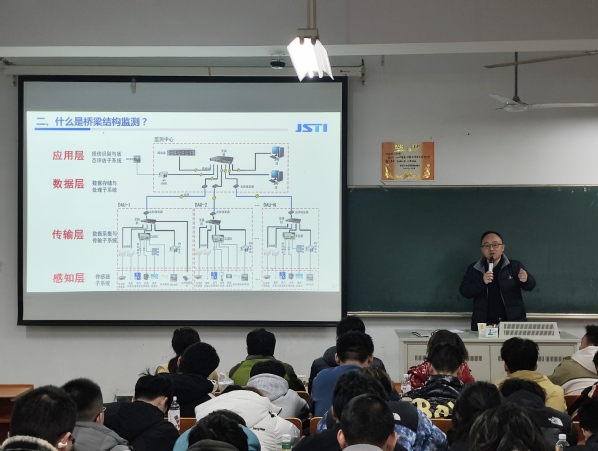 随后,在文昌院203教室,承宇教授围绕“桥梁结构监测技术的发展与应用以及桥梁轻量化监测技术探索与实践”主题,为同学们带来了一场专业讲座。近年来,长大桥梁结构健康监测技术发展迅速,但应用于量大面广的常规桥梁时,传统结构健康监测体系表现出越来越明显的不适应性,在此背景下,由苏交科集团首先提出的轻量化监测的理念越来越被市场认可,并通过省级建设指南的发布和管理办法的编制,得到了一些成功的应用。承宇教授介绍了桥梁轻量化监测的需求背景、顶层设计、已有探索和未来展望,重点介绍与传统结构健康监测系统相比,轻量化监测技术在定位上的差异、功能上的特点、监测指标与技术手段上的变化,以及近年来已形成的一些技术成果和得到的工程应用情况。