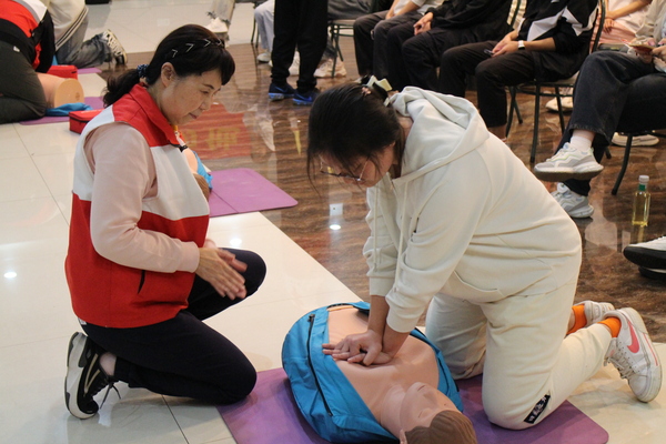 全天的培训包括理论知识讲解、实操教学及正式考核三个环节,内容涵盖生活中常见的红十字运动基本知识、心肺复苏操作技术、气道异物梗阻处置、常见急症和突发意外的急救处理。在知识讲解过程中,红十字会老师通过实例讲解、示范操作、现场演练等形式,用模拟人形象地演示了心肺复苏、气道异物梗阻、体外除颤仪等各类急救技能,并重点讲解心肺复苏的正确做法,包括怎样打开气道,怎样人工呼吸,按压的频率,告知学员们遇到突发情况如何第一时间作出反应,抓住急救“黄金4分钟”。在实操环节,同学们积极参与,认真学习,通过反复练习和模拟操作,逐渐掌握了心肺复苏、止血包扎等急救技能,为应对突发情况做好了充分准备。在正式考核中,老师对同学们的技能学习成果进行了实操检验,每一位同学都有条不紊、正确规范地进行了完整的救助操作,顺利通过了考核。