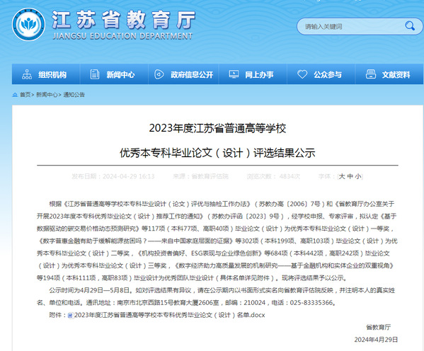 近日,江苏省教育厅发布《2023年江苏省普通高校本专科优秀毕业设计(论文)评选结果公示》,Beat365官网共有4项毕业设计(论文)获奖,二等奖1项、三等奖3项。