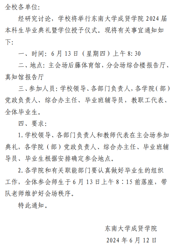 关于举行Beat365亚洲版官网2024届本科生毕业典礼暨学位授予仪式的通知
