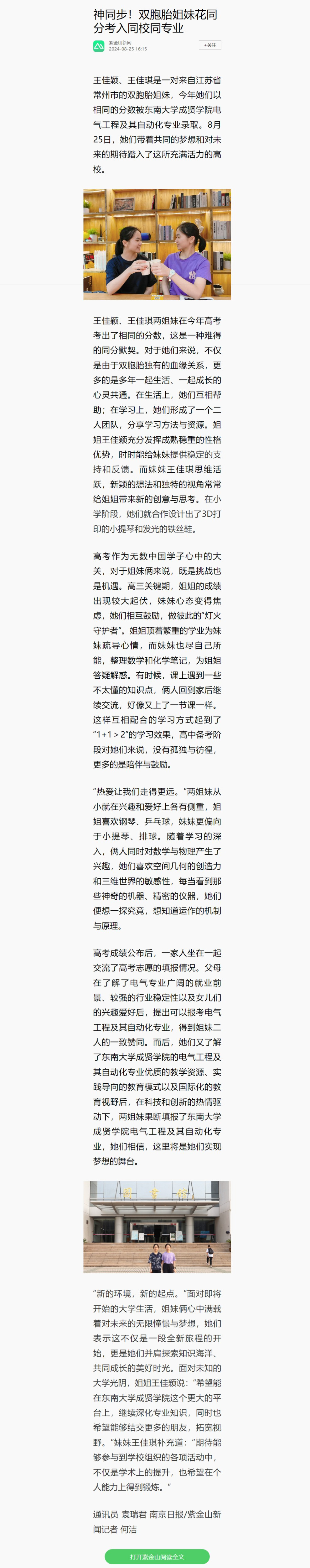 【南京日报】神同步!双胞胎姐妹花同分考入同校同专业