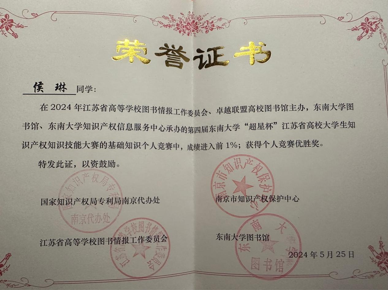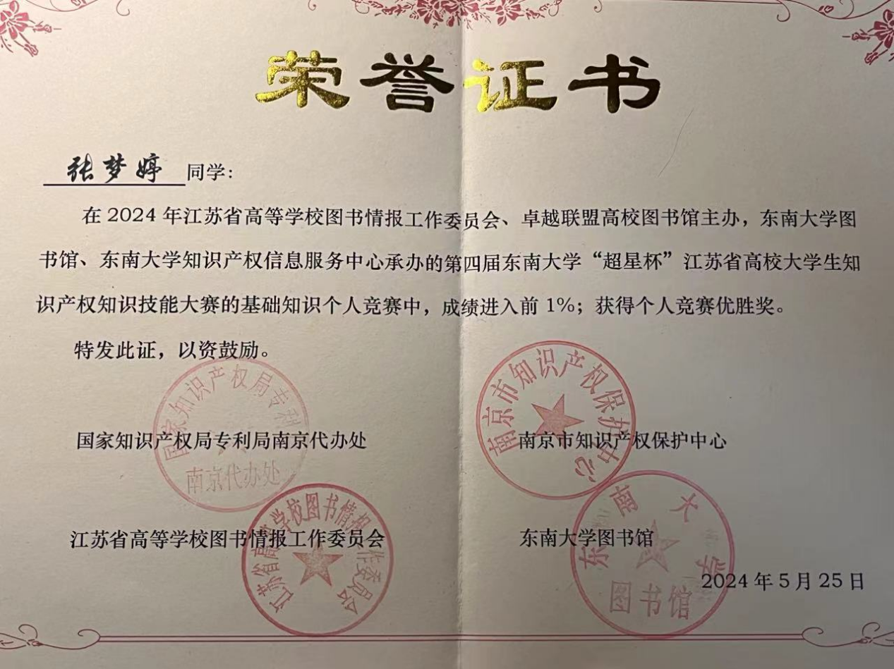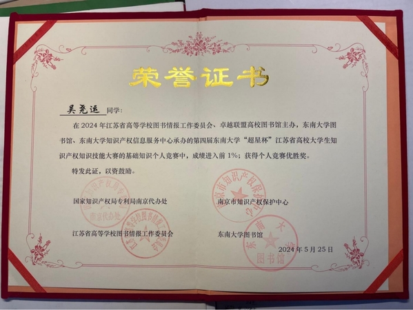 在Beat365官网图书馆的积极宣传和组织动员下,来自经济管理学院、机械与电气工程学院的张梦婷、侯琳、吴尧运、畅刘媛四名同学在知识产权基础知识个人竞赛中,从90所本专院校的近6000名本专科生和研究生同学中脱颖而出,在获得优胜奖的前65位获奖选手榜单上,分别获得第12名、第24名、第48名和第49名,成为获奖学生数总榜并列第2名、民办高校第1名的好成绩!刷新了Beat365官网近四年来参加本项活动的最高成绩!