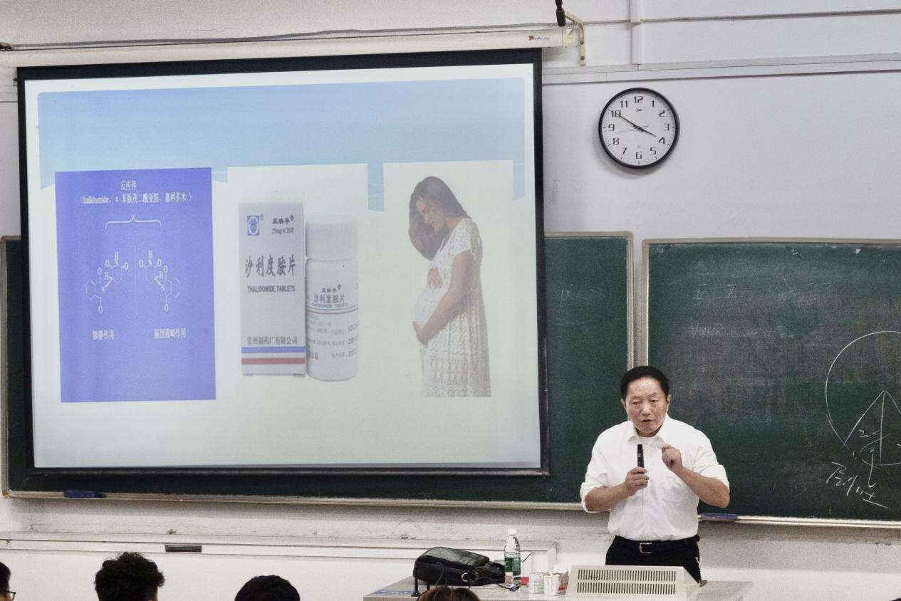 当天下午,中国药科大学硕士生导师梁毅教授面向全院药事管理专业学生主讲以“药事管理的定位和努力方向”为主题的讲座。梁教授简要概述了药品定义、药事管理及药事法规的相关意义,以德国反应停事例引出美国进口药品注册制度,并对该制度中药物化学研究资料的验证要求及分析要点进行了详细阐述。