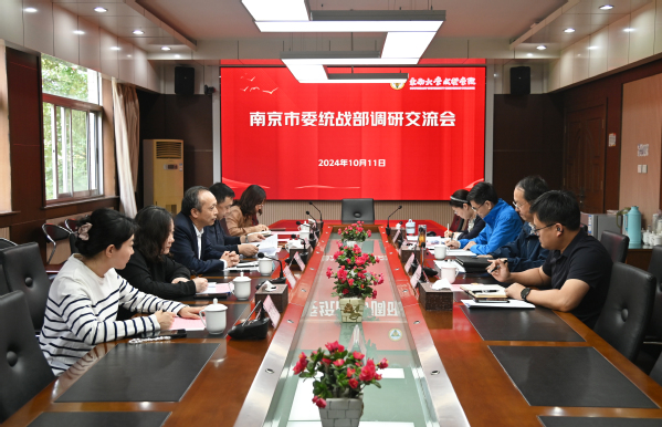 10月11日下午,中共南京市委统战部一级调研员符建基、侨经处处长郑晓伟,江北新区宣传和统战部一级调研员方强、统战办主任鲁小平一行莅临Beat365官网调研交流统战工作。Beat365官网党委书记张志胜、党政办公室主任周伟荣、组织人事部部长汪旭东等接待了来宾。