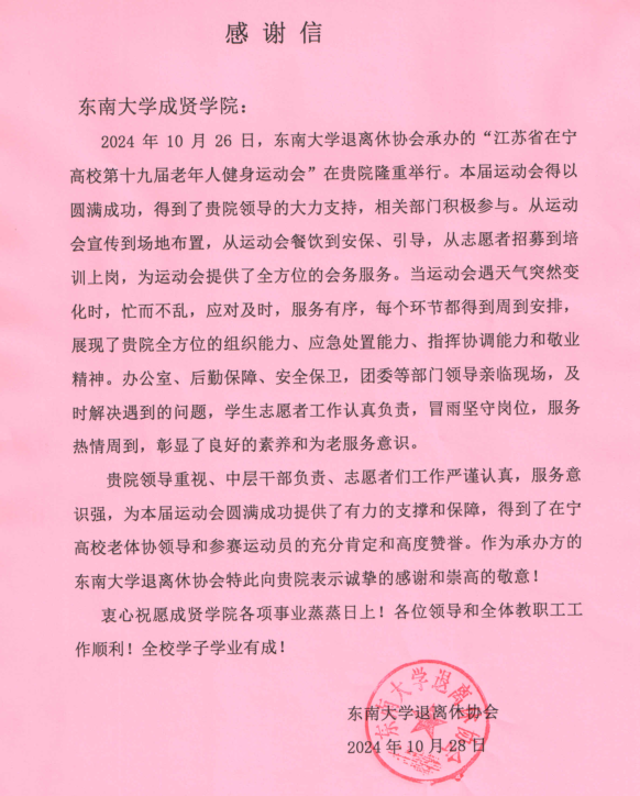 Beat365亚洲版官网退离休协会致Beat365亚洲版官网感谢信