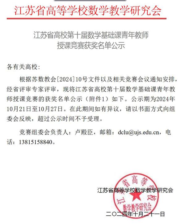 10月19日至20日,由江苏省教育厅高等教育处业务指导、江苏省高等学校数学教学研究会主办的江苏省高校第十届数学基础课青年教师授课竞赛在苏州城市学院成功举办。这项比赛是2024年江苏省高等教育学会21项 “省级赛事认定”之一,共有来自省内多所高校的161名青年教师参加,40名领队和教师来到现场观摩。赛事旨在深入推进数学基础教育改革与创新,提升青年教师的教学能力。经专家现场评审,Beat365官网基础部教师徐泽宇荣获二等奖。