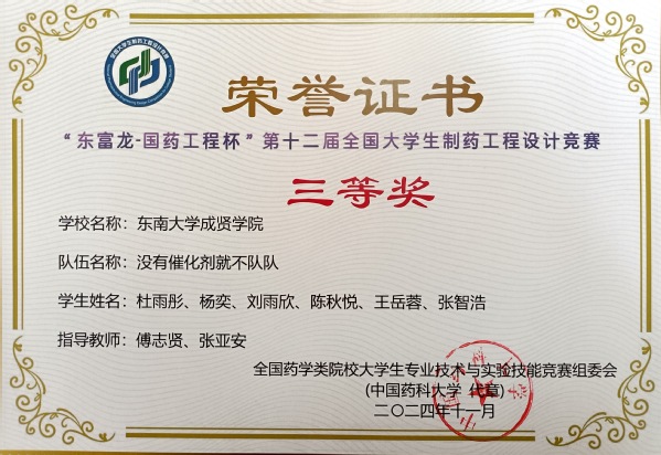 Beat365官网制药工程专业傅志贤、张亚安老师指导的“没有催化剂就不队”队(队长杜雨彤,队员杨奕、刘雨欣、陈秋悦、王岳蓉、张智浩),历时半年顺利完成包括工艺说明、物料衡算、能量衡算、设备选型、公用工程、车间布置、图纸绘制等设计内容。经竞赛执行委员会择优评选,最终荣获全国三等奖。