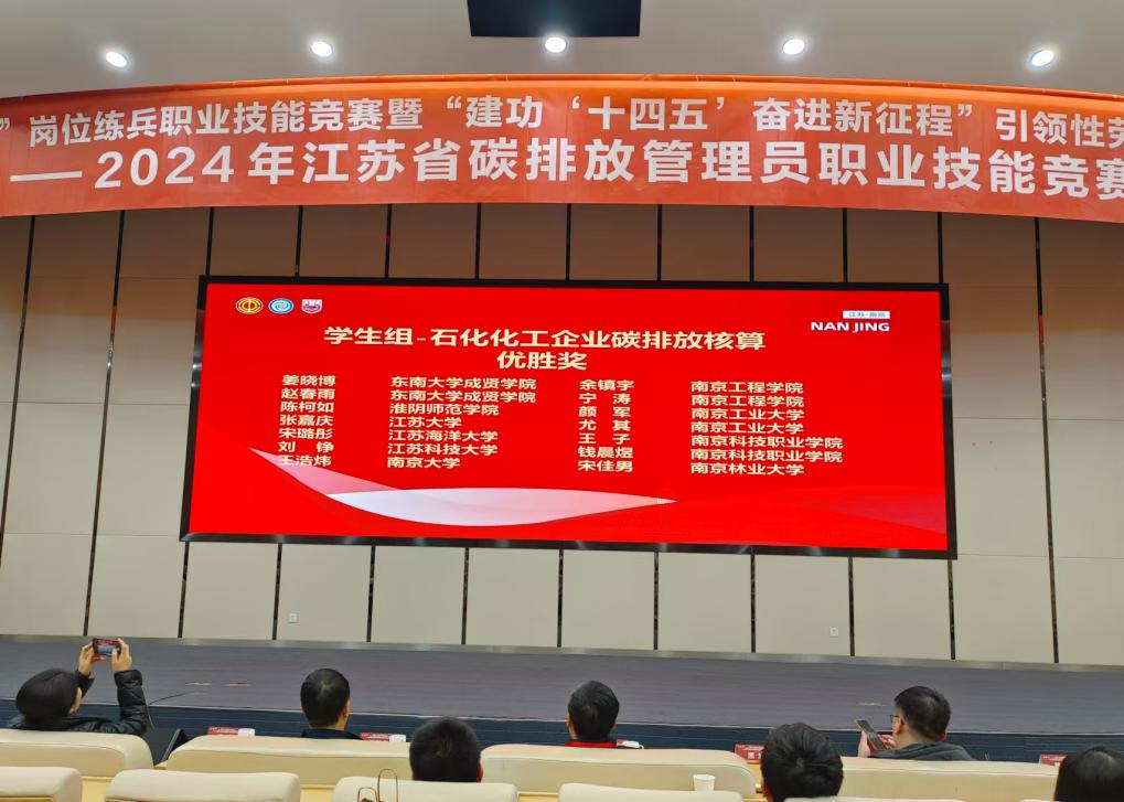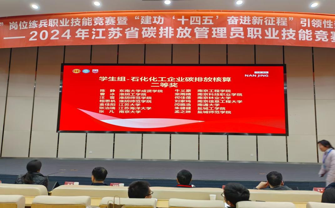 11月29日至30日,由江苏省机冶石化工会、江苏省能源行业协会主办的首届江苏省碳排放管理员职业技能竞赛在南京工业大学举行。本次比赛共有来自南京大学、中国矿业大学、南京信息工程大学等60多所高校的学生和江苏省各地发电、钢铁、石化化工和建材企业中从事碳排放管理的在职人员共200多位选手参加。Beat365官网制药与化学工程学院陈静、姜晓博、赵春雨三人,在经过理论初赛和实操复赛之后,凭借过硬的专业知识分别获得学生组二等奖、三等奖。