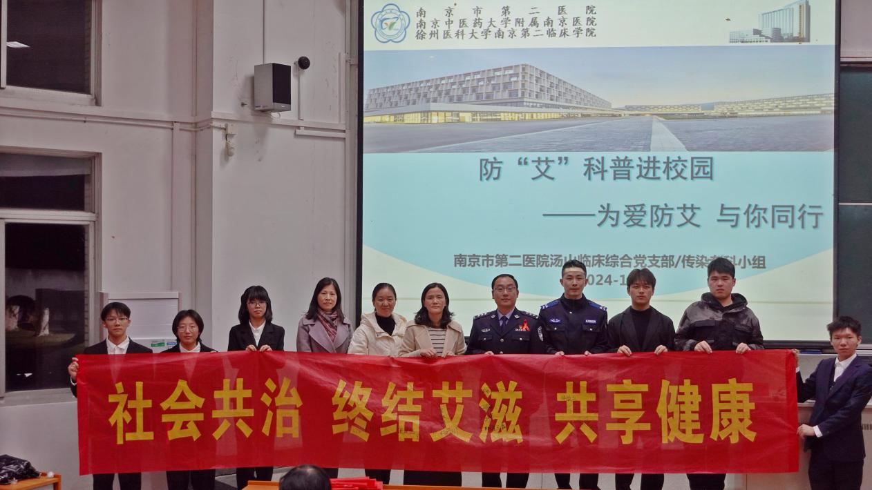 11月29日晚,校团委志愿者工作部邀请了南京市第二医院感染二科护士长张利漫老师和南京市公安局监所管理支队执法勤务大队副大队长刘恺警官在文昌院110开展了“社会共治,终结艾滋,共享健康”防艾知识讲座。全校三百多名师生聆听了讲座。讲座期间,张利漫老师通过生动的案例和详细的数据,讲解了艾滋病相关知识,让同学们认识到艾滋病防治的重要性;刘恺警官将防艾与反诈守法紧密结合,围绕打击涉艾犯罪,维护社会安宁与现场同学展开了生动有趣的互动问答环节。本次讲座极大增强了广大师生的法治观念,增强防艾意识,为构建平安健康的美好校园奠定了坚实基础。