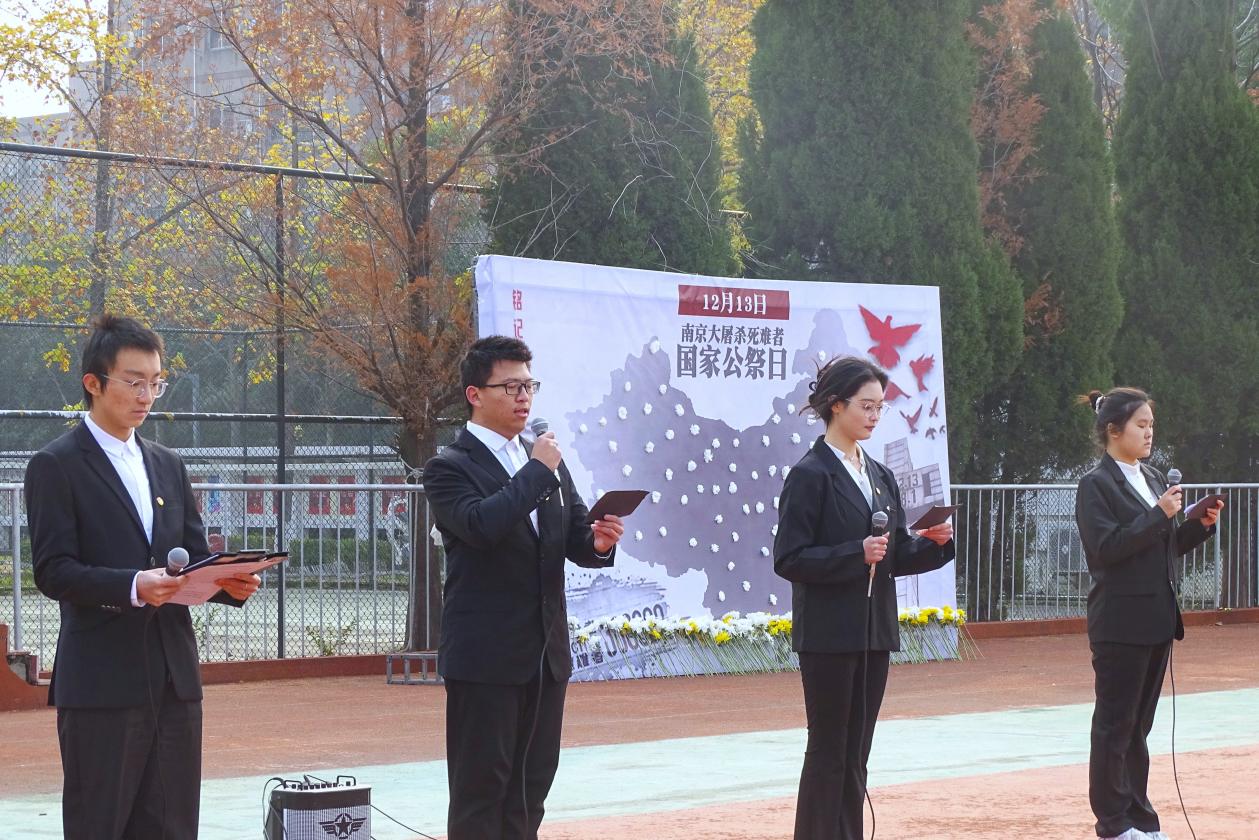 上午9时58分,悼念活动正式开始。本次活动首先奏唱《中华人民共和国国歌》并进行了庄严肃穆的升国旗、下半旗仪式。10时01分,防空警报声划破南京上空,全体师生为在南京大屠杀死难者和所有惨遭日本侵略者杀戮的死难同胞,为中国人民抗日战争献出生命的革命先烈和民族英雄集体默哀并献上鲜花寄托哀思,学生代表齐声朗诵《和平宣言》,发出庄严的和平誓言,铿锵有力,声声入耳。