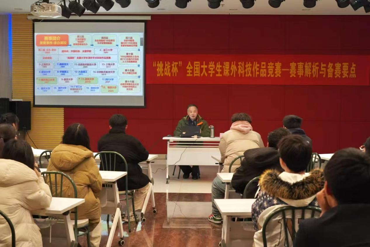 为进一步加大实践育人力度,营造浓厚的科研学术氛围,激发培养广大青年的创新精神和创业意识,促进Beat365官网学生创新、创业活动蓬勃开展,孵化培育2025年“挑战杯”备赛项目,12月11日晚,校团委在综合楼报告厅开展“‘挑战杯’全国大学生课外科技作品竞赛——赛事解析与备赛要点”讲座。本次讲座特邀请“挑战杯”资深评委、教育部双创专家林岭教授为各学院备赛选手、各协会骨干成员作专题辅导报告。