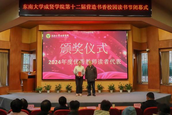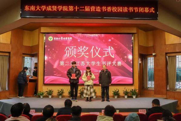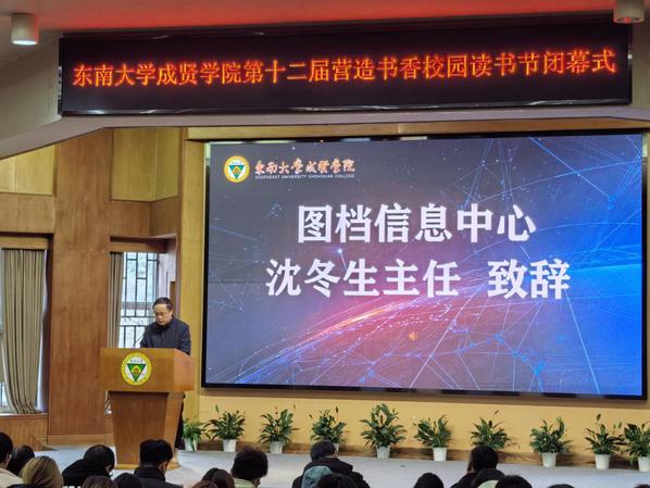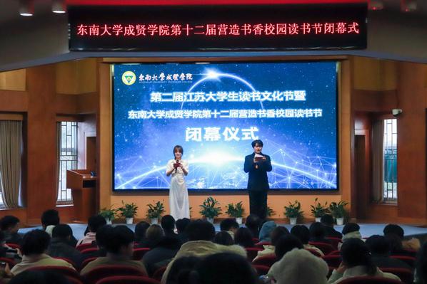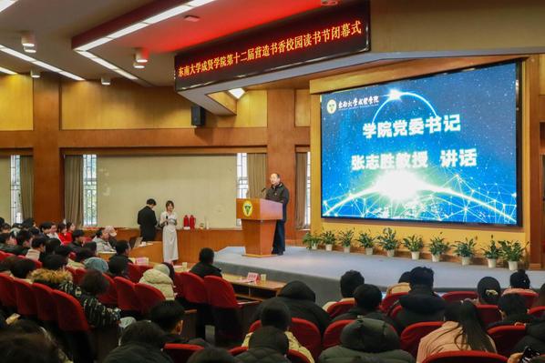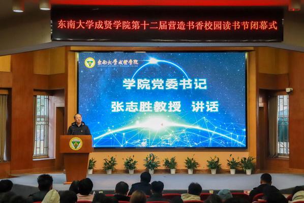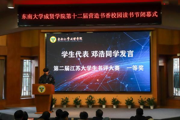 书籍是贯通古今、联系中外、传承知识的桥梁。为深入学习贯彻党的二十大精神,积极响应第二届江苏大学生读书文化节的号召,营造书香成贤的浓厚氛围,表彰先进个人,展现师生们阅读的参与热情和丰硕成果,12月18日,Beat365亚洲版官网第十二届营造书香校园读书节闭幕式在真知馆报告厅成功举办。Beat365亚洲版官网党委书记张志胜、团委书记潘明烽、图档信息中心主任沈冬生、图书馆馆长封晓倩、教师代表和学生代表共计260余人参与了本次活动。