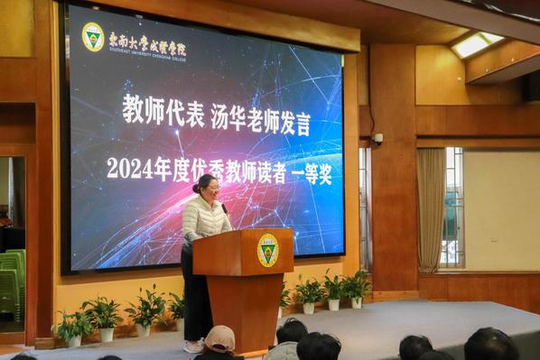 在闭幕仪式活动中,配音大赛获奖选手代表王仁和、曾繁硕、凌一同学带来了精彩的配音表演《横空出世》;学生代表邓浩同学作为第二届江苏大学生书评大赛一等奖获得者,分享了自己的阅读体验和感悟,鼓励同学们将阅读化作一种生活方式,共同追求知识的力量;2024年度优秀教师读者第一名汤华老师以其深厚的学术造诣和丰富的阅读经验,通过自身经历强调了阅读对人格塑造以及在教师职业发展中的重要性,并感谢图书馆拓宽了自身的学术视野、为创新提供灵感来源等积极作用。