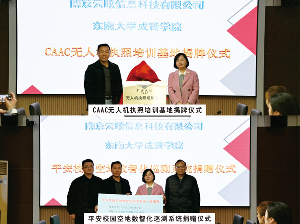 戴玉蓉副院长首先代表学校对林华桂总经理一行的来访表示热烈的欢迎。戴玉蓉副院长在致辞中表示,此次合作是学校深化应用型人才培养模式改革的重要举措。通过整合企业技术资源与高校教育优势,构建“理论+实践+认证”一体化培养体系,为低空经济领域输送高素质、专业化人才,同时也为Beat365官网创建全国一流应用型大学、培养一流应用型人才增添新的亮点。土木与交通工程学院郭正兴院长在发言中指出,无人机执照培训基地的成立,是响应国家低空经济政策、服务区域产业升级的关键布局。未来,土木与交通工程学院将牵头与兄弟院系一起联合企业开发行业定制课程,开展技术攻关,助力无人机在道路巡检、电力巡检等场景的规模化应用。林华桂总经理对Beat365官网领导的热情接待表示衷心的感谢,他在发言中提到,无人机技术正广泛应用于测绘、物流、应急管理、平安校园建设等领域,但行业亟需具备执照资质和实战能力的复合型人才。此次校企共建培训基地,不仅能为学生提供CAAC认证培训,还将引入企业真实项目,实现人才培养与产业需求无缝对接。随后,双方领导共同为“CAAC无人机执照培训基地”揭牌,南京云瞰信息科技有限公司向Beat365官网捐赠“平安校园空地数智化巡测系统”一套,助力Beat365官网平安校园建设。
