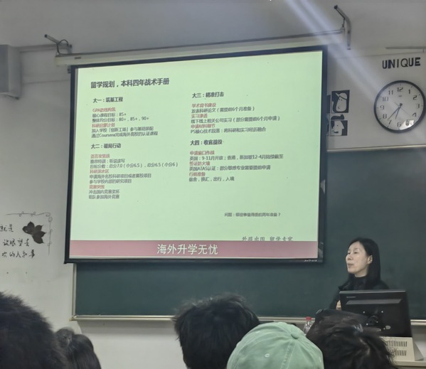 宣讲会上,程闽老师做了四个主题内容宣讲:第一,学生在四年本科学习过程中应该如何做好海外留学全规划,她详细介绍各个年级不同阶段的留学战术;第二,如何做好留学材料制作实战方案,她从学术背景补救方案、实践经历包装策略、推荐信话术、文书核心策略等方面阐述了材料制作的核心内容;第三,如何做好考研与留学同步推进双保险策略;第四如何使用“外服留学直通车”申请递交系统,她详细介绍了系统的核心优势。学生注册即可使用,自由选择全球100+所合作院校及专业。功能齐全、提供材料清单及模板、实时查看申请进度,成贤学子免费使用。目前,已有多名成贤学生通过“外服留学直通车”申请递交系统成功申硕成功。最后,程老师向大家介绍了部分留学国家和地区硕士学制及基本费用。