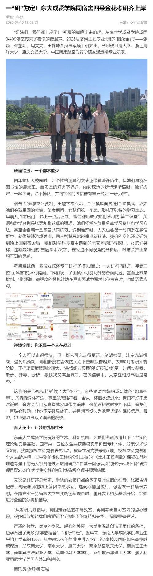 【交汇点新闻】一“研”为定!东大Beat365亚洲版官网同宿舍四朵金花考研齐上岸