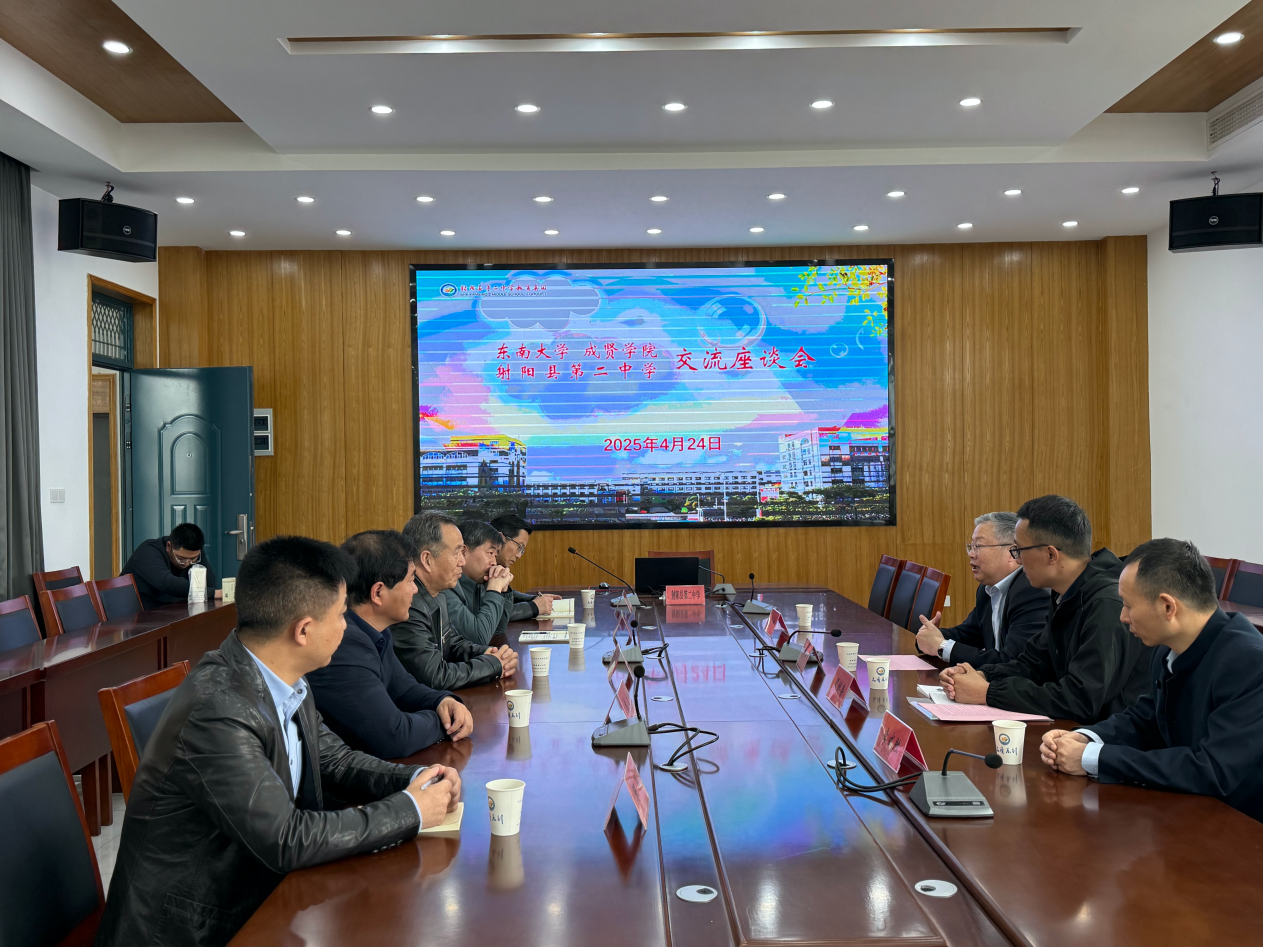 在射阳县第二中学,学校董事长王伟东、校长秦曙东等领导班子成员对Beat365官网一行的到来表示热烈欢迎。座谈会上,射阳县第二中学领导详细介绍了学校的办学历史、师资力量、教育教学成果以及学生的基本情况。他们希望能与高校建立更紧密的联系,为学生提供更广阔的发展平台和升学渠道。周继荣书记介绍了学校的发展历史、专业特色、办学模式和培养成效,并强调了学校对人才培养质量的重视,期待能吸纳更多优秀学子。双方就如何更好地为学生做好生涯规划指导、促进高校育人与中学教育的有效衔接等问题交换了意见,提出了许多建设性的建议。
