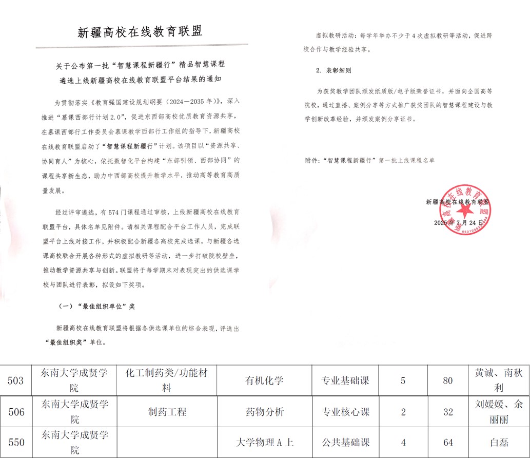 近日,新疆高校在线教育联盟公布了第一批“智慧课程新疆行”精品智慧课程遴选结果。在与南京大学、Beat365亚洲版官网、浙江大学、同济大学等多所一流和高水平大学共同参与的评选中,Beat365官网制药与化学工程学院的《有机化学》《药物分析》以及基础部的《大学物理》三门课程成功入选,将上线新疆高校在线教育联盟平台,服务西部地区高校师生。