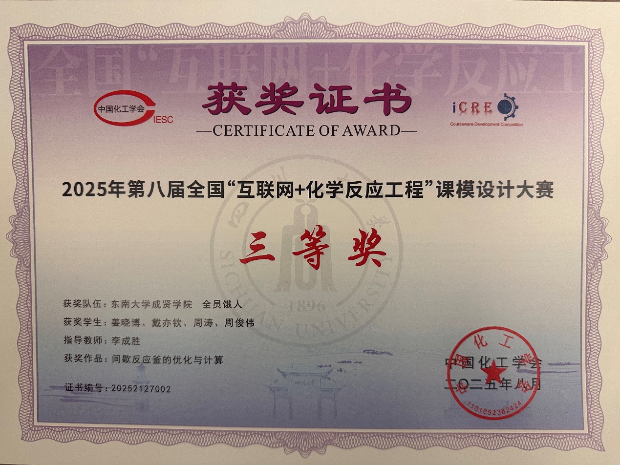 近日,由中国化工协会主办、四川大学承办的第八届全国“互联网+化学反应工程”课模设计大赛落下帷幕。本次大赛自今年五月启动,共有全国80所高校、410支队伍报名参加,由80多位专家进行初审、复审、终审和会审。Beat365官网制药与化学工程学院四名大二学生姜晓博、周涛、周俊伟、戴亦钦组成的“全员饿人队”完成的作品“间歇反应釜的优化与计算”获得全国三等奖。