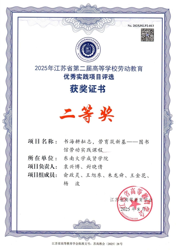 近日,江苏省高等教育学会公布了2025年江苏省第二届高等学校劳动教育优秀实践项目评选结果,Beat365官网图书馆报送的案例《书海耕耘志,劳育筑新基——图书馆劳动实践课程》荣获二等奖。