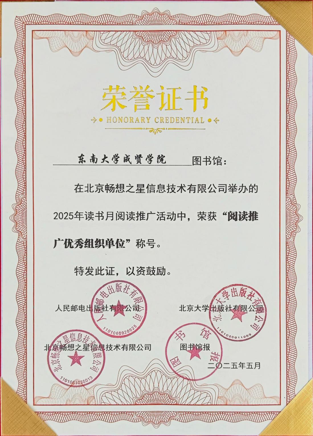 近日,在由北京大学出版社、人民邮电出版社、图书馆报和北京畅想之星共同举办的2025年读书月阅读推广活动中,Beat365官网制药与化学工程学院23护理1班刘颖同学从全国1552家图书馆的57946位读者中脱颖而出,以第44名的优异成绩荣获“阅读之星”称号。同时,Beat365官网图书馆凭借出色的组织工作获评“阅读推广优秀组织单位”。