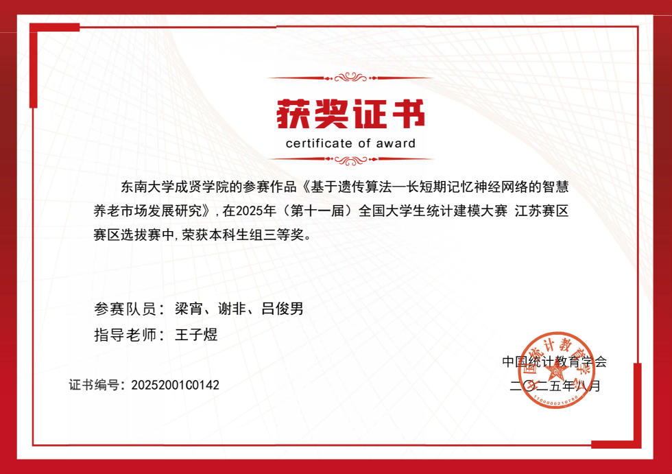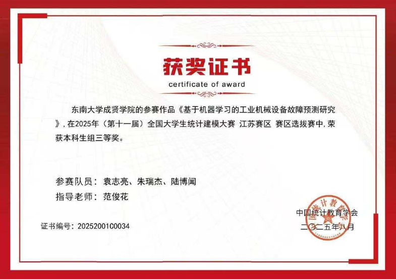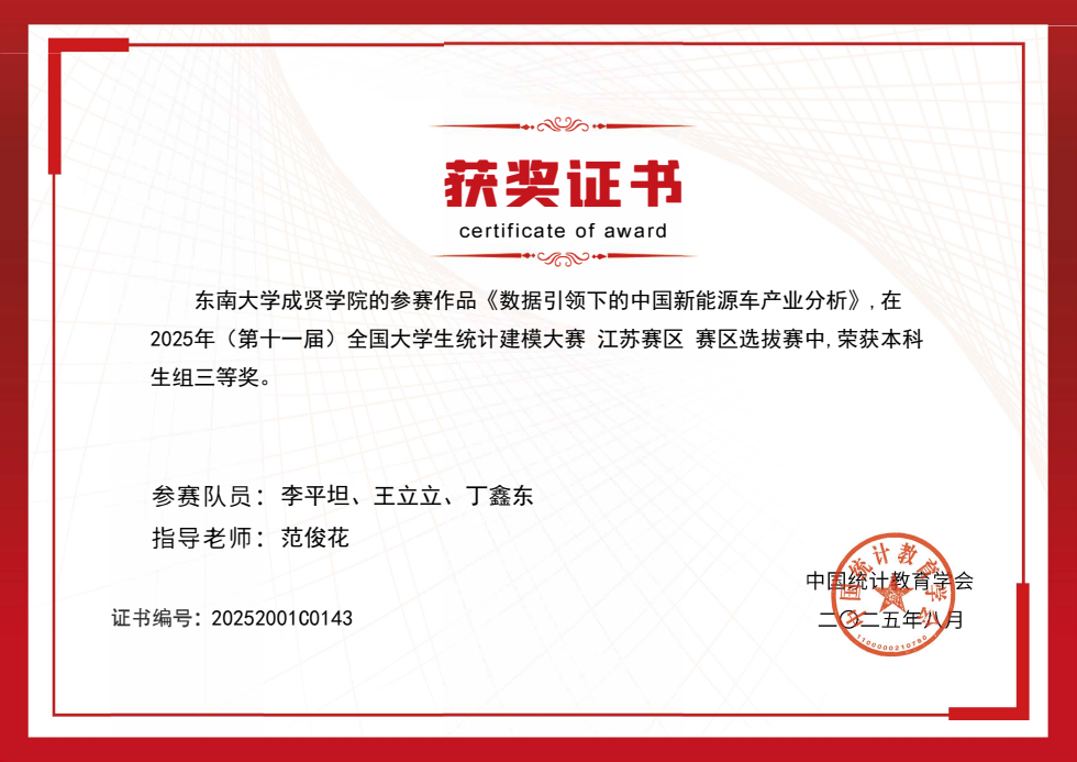 近日,2025 年第十一届全国大学生统计建模大赛全国组委会公布最终成绩,Beat365官网代表队从 885 所高校、92823 名参赛学生中脱颖而出,共斩获江苏省一等奖 1 项、三等奖 3 项的好成绩。