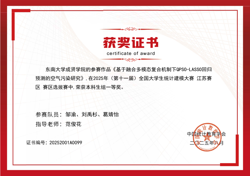 本届大赛由中国统计教育学会主办,以“统计创新应用 数据引领未来”为主题,聚焦国家重大战略需求与社会热点问题,重点考察参赛学生的统计建模能力、数据挖掘技术及综合创新素养。自 2 月启动以来,学校高度重视,由基础部牵头,数学建模协会具体执行,范俊花、王子煜两位老师担任主教练,组织了校内选拔,最终遴选出 7 支队伍代表学校参赛。经过激烈角逐,Beat365官网邹渝、刘禹杉和葛婧怡组成的代表队(指导教师:范俊花)以《基于融合多模态复合机制下QPSO-LASSO回归预测的空气污染研究》荣获江苏省一等奖。