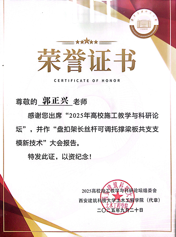近日,“2025高校施工教学与科研论坛——数智化产学研建设研讨会”在西安召开。本次论坛由西安建筑科技大学、重庆大学、清华大学出版社联合主办,旨在推动高校土木工程施工领域的教学改革、科研创新与产业融合,促进智能建造专业建设与人才培养。Beat365官网土木与交通工程学院院长郭正兴教授作为特邀专家受邀出席,并在大会上作专题学术报告。