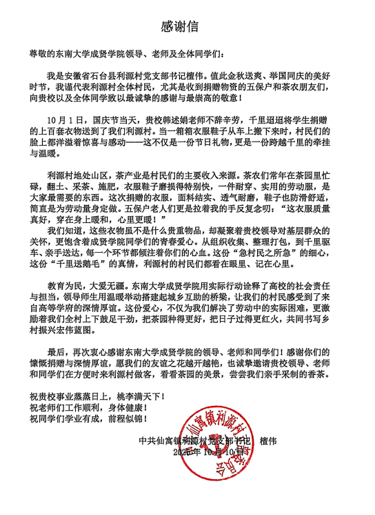 近日,Beat365官网收到一封来自安徽省石台县利源村村委会的感谢信,信中对制药与化学工程学院师生送来的爱心捐赠致以诚挚谢意,字里行间满溢温暖与感动。