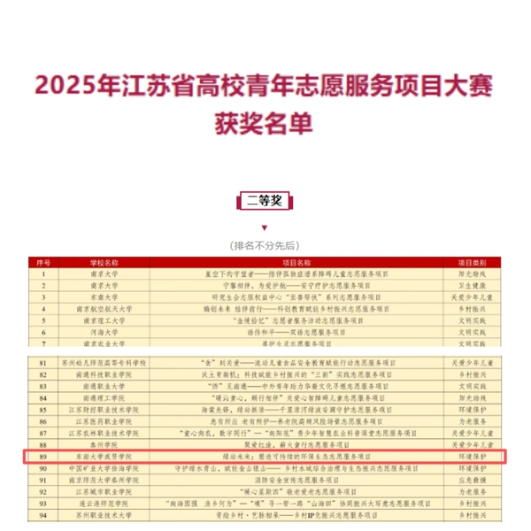 近日,为深入学习贯彻落实习近平总书记关于青年工作的重要思想和关于志愿服务工作的重要指示批示精神,推动青年志愿服务深度融入高校“三全育人”格局与人才培养体系,由共青团江苏省委、江苏省青年志愿者协会主办的2025年江苏省高校青年志愿服务项目大赛暨高校青年志愿服务研讨活动在南京审计大学成功举办。在此次大赛中,Beat365官网“绿动未来:塑造可持续的环保生态”志愿服务项目在全省115所高校384个志愿服务项目中脱颖而出,最终斩获二等奖的好成绩。