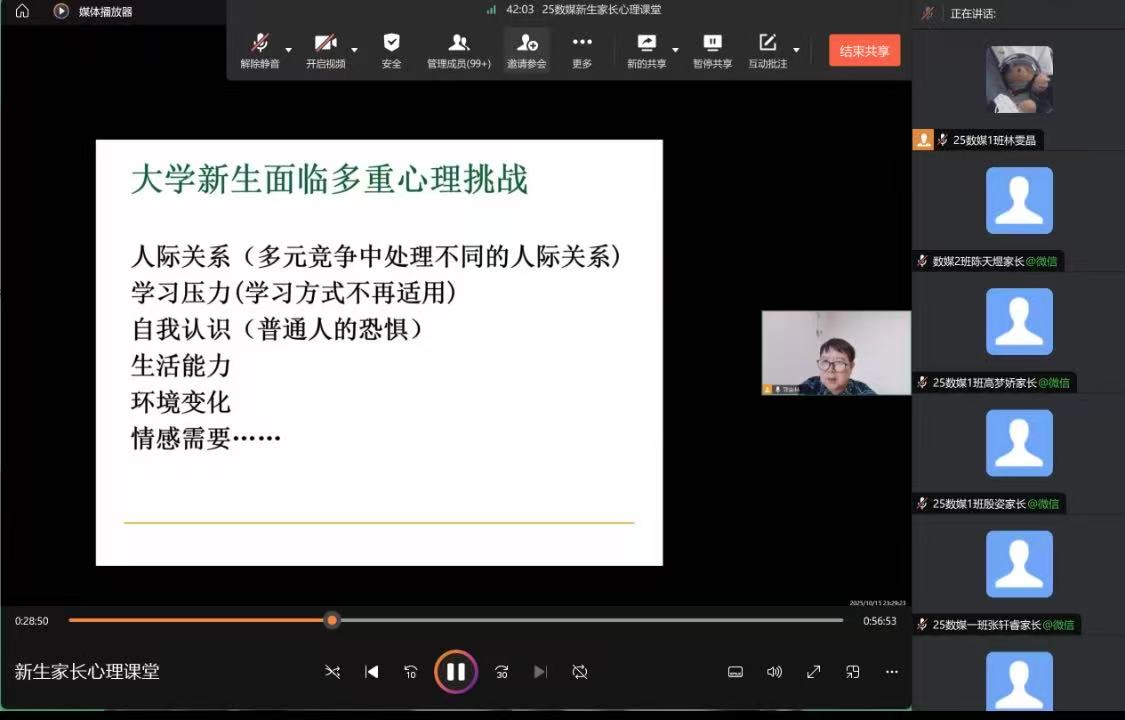 10月20日至24日,由学生处主办、心理健康教育中心承办的新生家长心理大讲堂活动圆满结束。本次讲座由原Beat365亚洲版官网心理健康教育中心主任郭晋林老师担任主讲,以“大学生入学适应期的心理挑战与家校协同支持策略”为核心展开,2025级全体新生家长聆听了此次讲座。