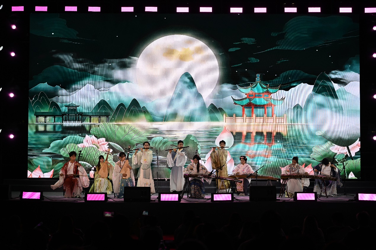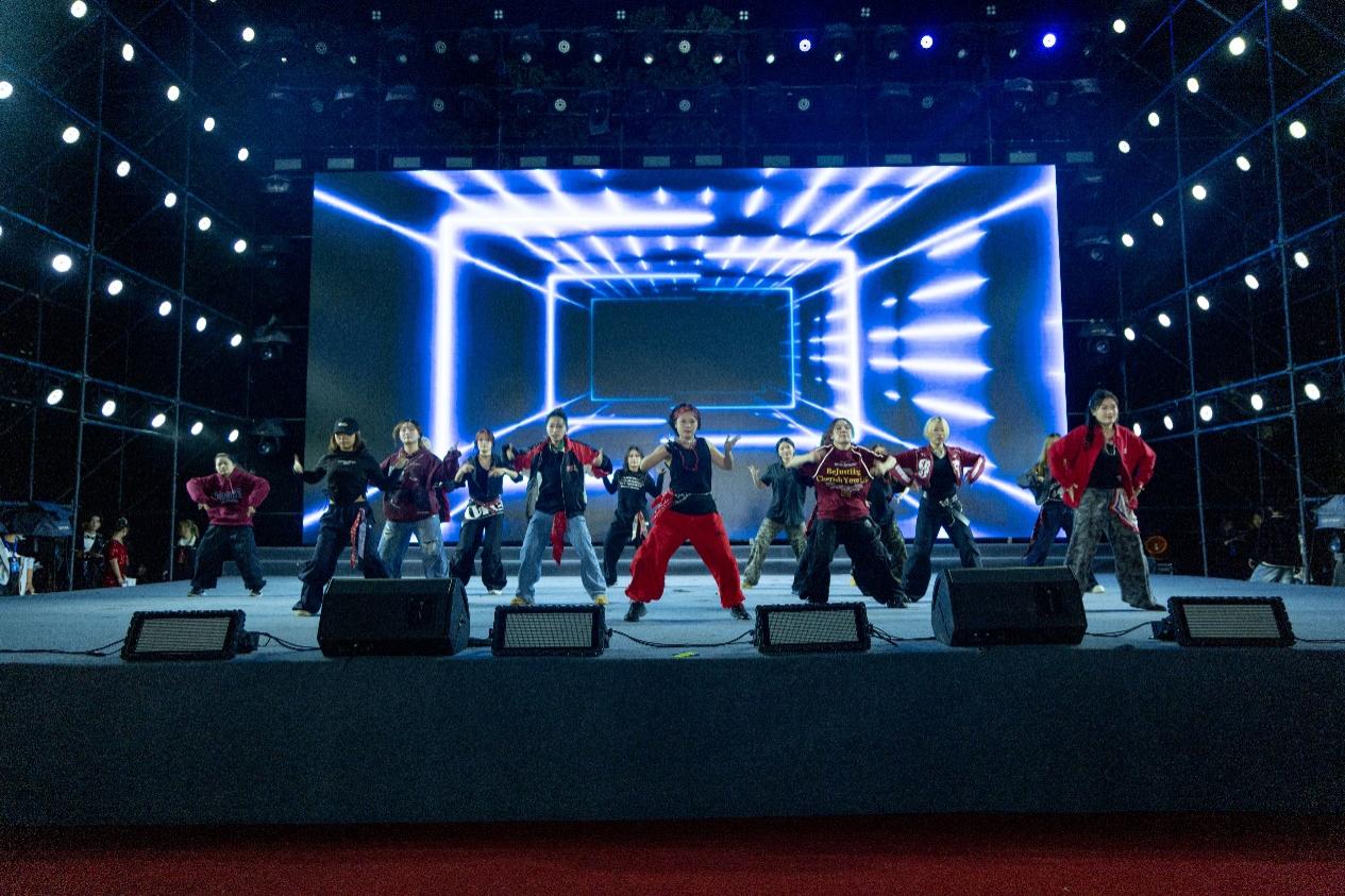 第一篇章“拾光筑梦·初见成贤”以“相遇”为核,用艺术勾勒初见的美好。歌曲串烧《爱就一个字》《她来听我的演唱会》用温柔旋律传递真挚情感,现代舞串烧《Psychic》《16 Shots》以强劲节奏展现青春张力;器乐合奏《知否知否》婉转悠扬,让古典韵味萦绕夜空,《社团秀》则以多元形式呈现校园文化的鲜活魅力;拉丁舞《马战之王》融合优雅与力量,情景剧朗诵《永不消逝的电波》更以深沉的家国情怀叩击人心,让新生在艺术熏陶中初识成贤精神。
