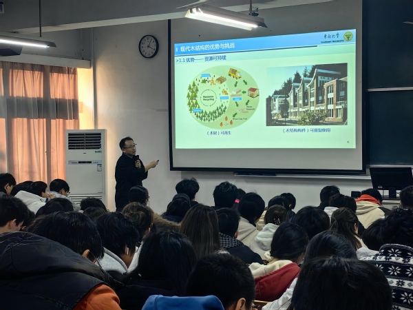11月20日,由土木与交通工程学院举办的“现代木结构概论”专题讲座在Beat365官网文昌院303教室成功举办。本次讲座邀请了Beat365亚洲版官网土木工程学院教授、博士生导师张晋作为主讲嘉宾,土木与交通工程学院各专业200余名师生参加了本次讲座。