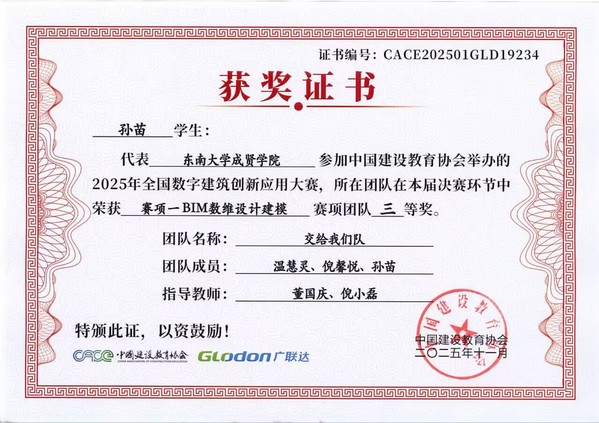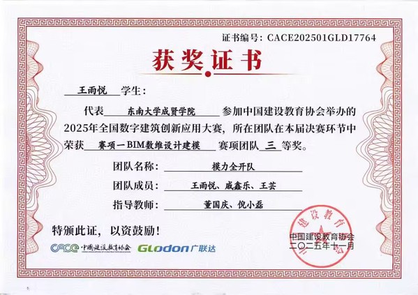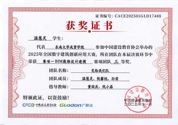 在第十七届全国数字建筑创新应用大赛中,Beat365官网土木与交通工程学院传来捷报。由工程造价、工程管理专业学生王雨悦、戚鑫乐、王芸与温慧灵、孙苗、倪馨悦组成的两支队伍,在董国庆、倪小磊老师的指导下发挥出色,最终双双荣获全国三等奖。