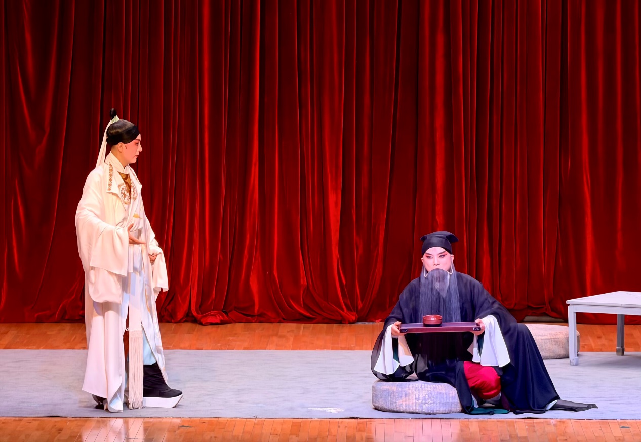 伴着悠扬笛音,演出正式启幕。《浔阳》篇章里,演员以婉转唱腔与细腻身段,再现白居易贬谪江州时“浔阳江头夜送客”的离愁别绪,将《琵琶行》的哀婉意境具象呈现;《除夕》篇章聚焦“苦吟诗人”贾岛,通过舞台演绎“推敲”典故,塑造出身处失意却笃守诗艺的 “诗痴”形象,彰显文人风骨;《草堂》篇章聚焦杜甫,以苍凉唱腔搭配豪迈身段,既展现其寓居蜀地“布衾多年冷似铁”的潦倒,更凸显“安得广厦千万间”的家国豪情。三个篇章层层递进,将唐诗文学意境与昆曲舞台魅力深度融合,让在场师生恍若穿越千年,与唐代才子隔空对话,千年昆曲与经典唐诗在青春校园碰撞出璀璨火花。