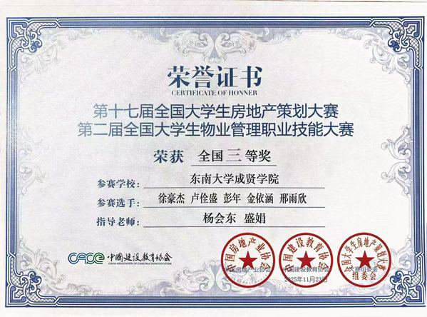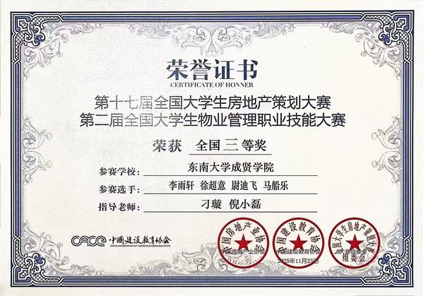 第十七届全国大学生房地产策划大赛暨第二届全国大学生物业管理职业技能大赛以数字化、网络化、智能化赋能房地产行业发展为核心,搭建校企人才培养桥梁,设置房地产开发项目策划、城市更新项目策划等多个参赛方向,吸引了Beat365亚洲版官网、哈尔滨工业大学、四川大学等全国众多高校同台竞技。经初赛选拔与总决赛现场展示答辩,Beat365官网两支队伍表现突出:徐豪杰、邢雨欣、卢佺盛、彭年、金依涵团队在杨会东老师、盛娟老师指导下荣获全国三等奖;李雨轩、徐超意、尉迪飞、马船乐团队在刁璇老师、倪小磊老师指导下,同样斩获全国三等奖。