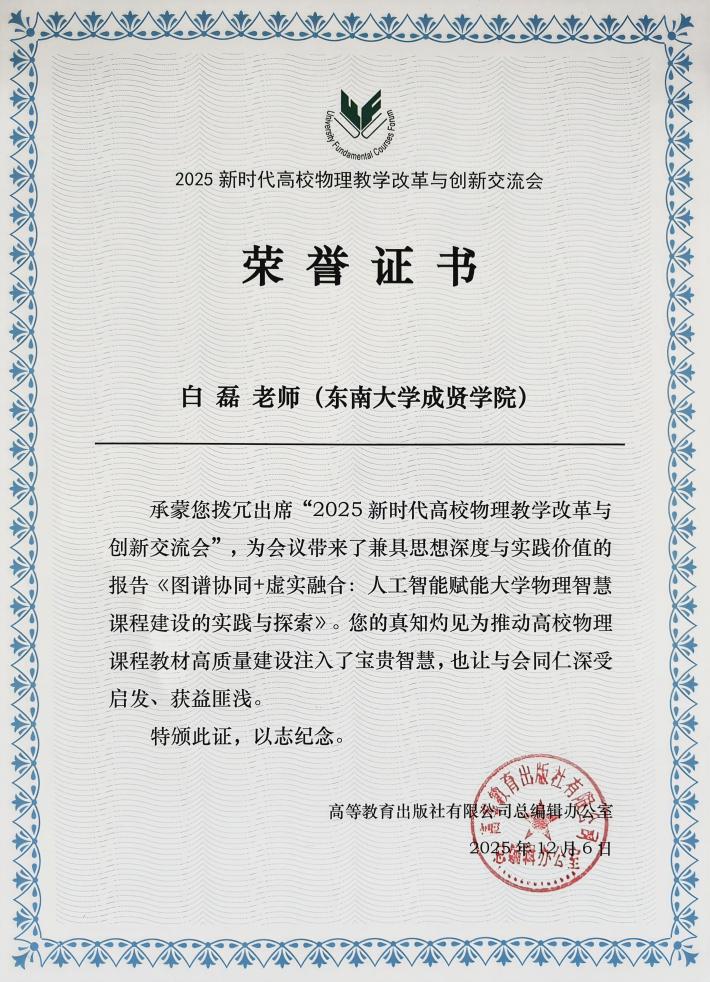 12月5日至8日,由教育部高等学校物理学类专业教学指导委员会、教育部高等学校天文学类专业教学指导委员会、教育部高等学校大学物理课程教学指导委员会、中国物理学会物理教学委员会和高等教育出版社联合主办,Beat365亚洲版官网物理学院承办的“2025新时代高校物理教学改革与创新交流会”在南京举行。Beat365官网基础部部长李兴鳌教授带队,率领白磊、刘冬梅、王子煜三位教师参加本次会议。