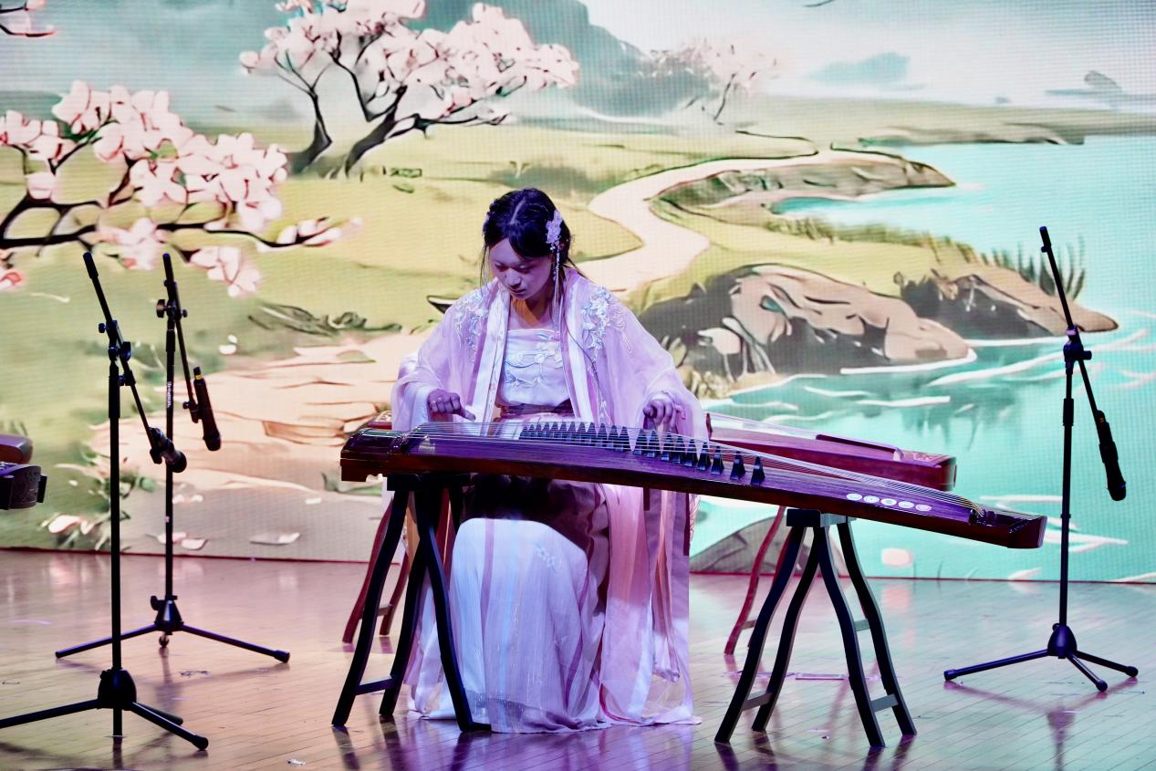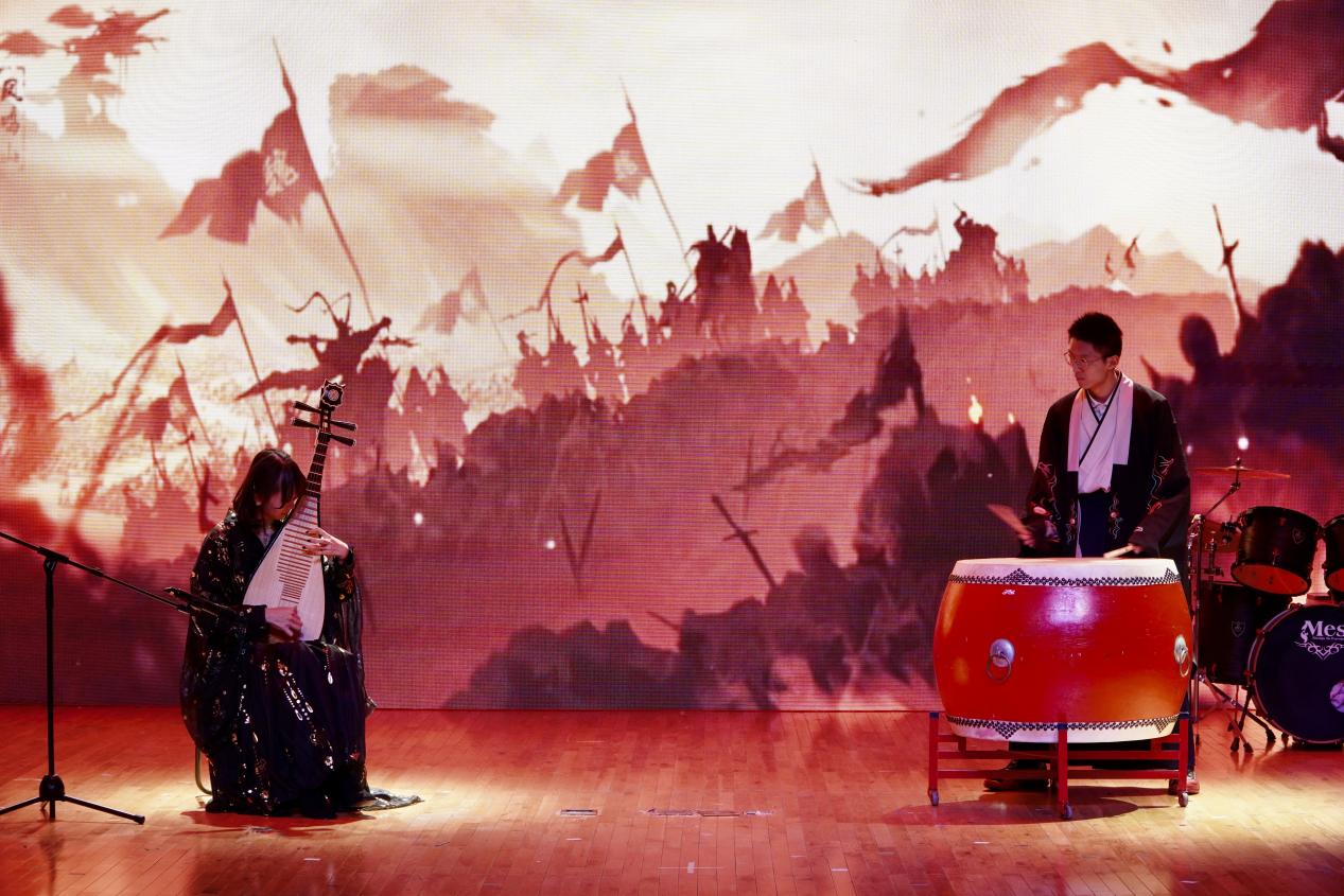 演出在悠扬的旋律中徐徐展开,一曲《兰亭序》拉开序幕,婉转曲调勾勒出传世名篇的雅致意境;古筝重奏《山居秋暝》《战台风》接连登场,前者以清雅之音描摹秋日山林的静谧悠然,后者凭激昂旋律彰显风雨来袭的磅礴气势;琵琶独奏《十面埋伏》节奏急促、铿锵有力,将古战场的紧张氛围与激烈交锋刻画得入木三分;竹笛与钢琴合奏的《美丽的神话》,让民族乐器的悠扬与西洋乐器的醇厚完美交融,诉说着跨越时空的动人情愫;吉他弹奏《All Falls Down》节奏明快,尽显青春朝气;小提琴演绎《第二圆舞曲》旋律流畅,带领观众沉浸在典雅浪漫的音乐世界;竹笛合奏《那些年》唤起全场师生的青春记忆,以熟悉的曲调引发阵阵共鸣;《Fly Me to the Moon》以灵动音符勾勒月夜梦幻,《万疆》以恢宏旋律礼赞祖国山河;钢琴独奏《第一钢琴协奏曲第二乐章》尽显古典隽永,《Walking by the World》融合东方韵律与西方和声,为这场冬日音乐雅会画上圆满句号。